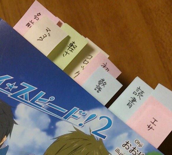 今回はじめて付箋作業してみたけどこれは便利!(青=ハルちゃんポイント、緑=まこちゃん、黄=渚・宗助他 ピンク=まこはる)